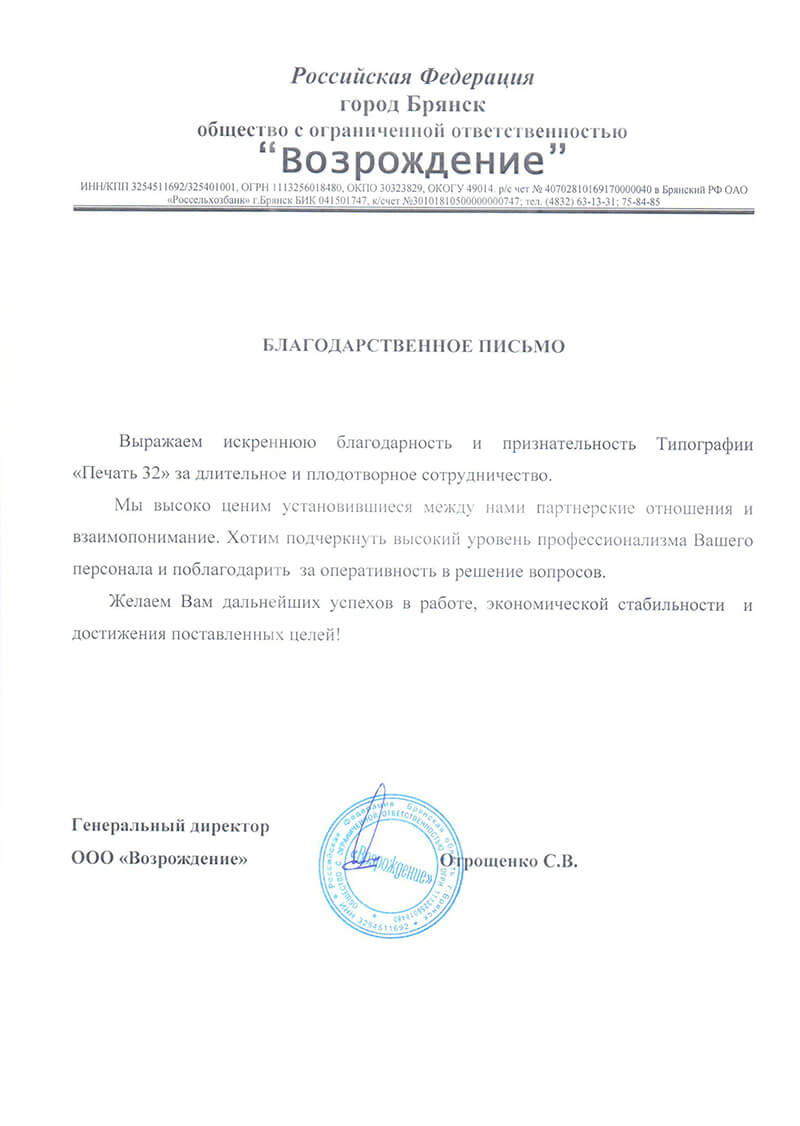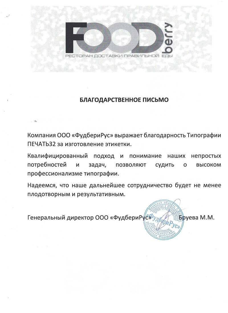 Хотели поблагодарить руководство и коллектив компании “Печать32” за оперативное и максимально качественное решение наших вопросов по изготовлению этикетки.